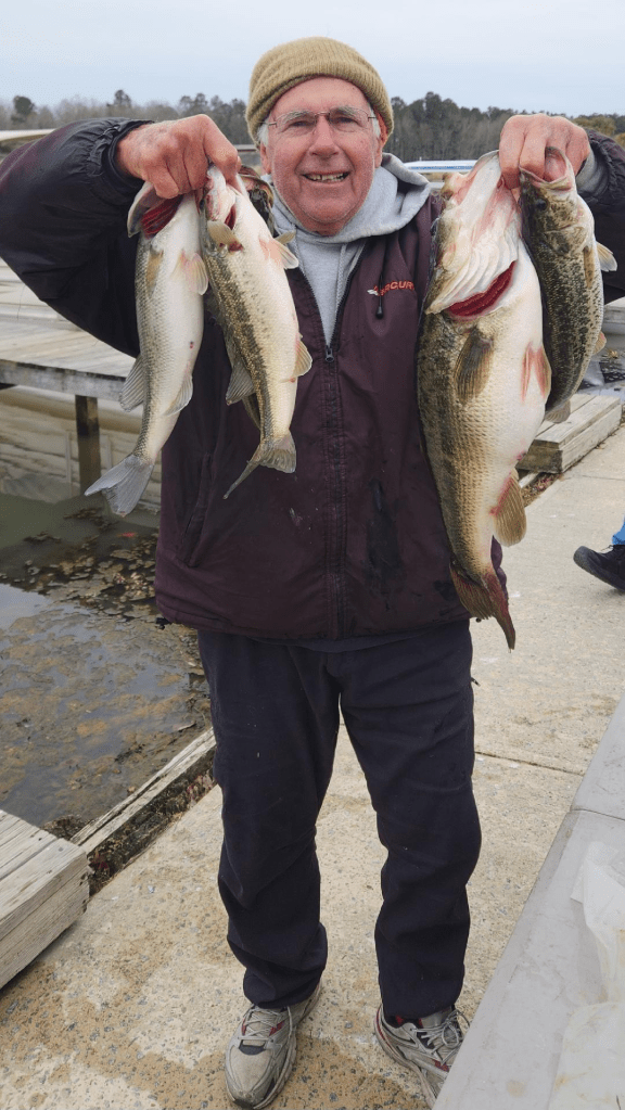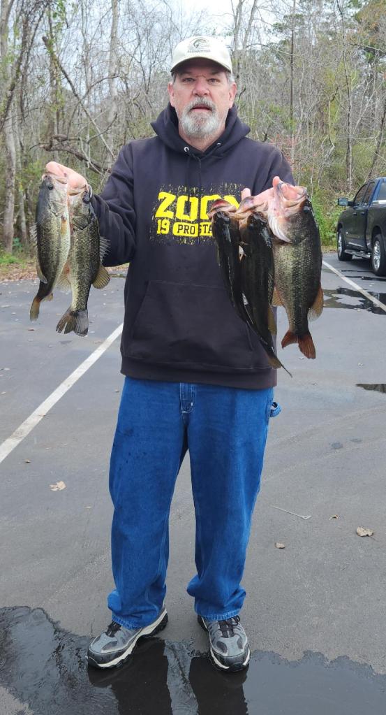 On a cold, windy and rain day with no angler bringing in a limit, all it took was one big bite to take 1st. Jim Rozelle had a big fish weighing an impressive 10.89lbs and his 2 fish total was 12.48lbs to take the win. Teddie Thiele had a total of 8.66lbs on 2 bass to take 2nd. With 3 bass weighing 7.74lbs Buddy Robertson took 3rd place. A total of 15 bass weighing 47.21lbs for an average of 3.15lbs.